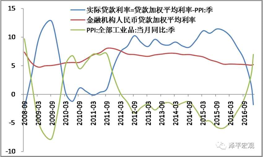 我們把貸款加強利率減掉PPI作為實際貸款利率,2014、2015年我們不斷的降息、降準,政策基準利率處在歷史的低位,但是我 們PPI不斷的回升,意味著實際貸款利率是大幅下降的。比如說一個企業(yè)的資產(chǎn)負債表,借款的融資成本是在歷史的低位,但是資產(chǎn)在不斷的漲價,你會怎么辦? 你肯定很愿意借錢。