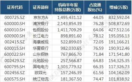 把半年報各類機構(gòu)持股情況與一季報進行比較的話,結(jié)果顯示,機構(gòu)增倉10億股以上的有11只個股(見下表)。其中,京東方A(000725)(83.26億股)、浦發(fā)銀行(600000) (50.89億股)、包鋼股份(600010) (42.75億股)的機構(gòu)增倉數(shù)居前三位,在機構(gòu)大幅增倉的同時這些個股也都有不錯的表現(xiàn)。
