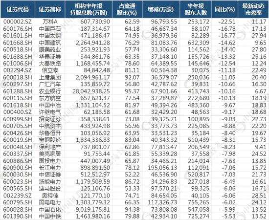 其中,機構(gòu)持股數(shù)超過100億股的有31只個股,持股數(shù)在200億股以上的有12只個股(見下表),清一色是滬市權(quán)重藍籌,這也符合上半年“漂亮50”因為機構(gòu)抱團而大發(fā)神威的市況。