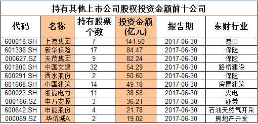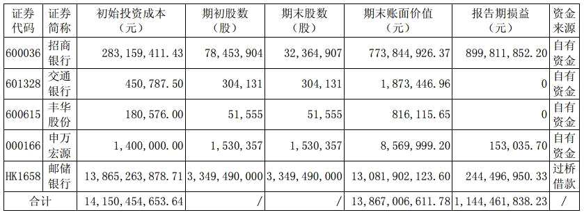 其中,投資金額最高的為上港集團(tuán)。半年報(bào)顯示,上港集團(tuán)共持有招商銀行(600036) 、交通銀行(601328) 、豐華股份(600615) 、申萬(wàn)宏源(000166)4家A股公司和郵儲(chǔ)銀行1家H股公司的股份,初始投資成本高達(dá)141.5億元,其中,由于上港集團(tuán)去年作為基石投資者參與郵儲(chǔ)銀行H股IPO,僅郵儲(chǔ)銀行一家公司的初始投資成本就高達(dá)138.65億元。