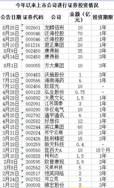 投資股票數(shù)量最多的則是桂東電力。雖然總投資金額不大,單只股票的投資金額大多數(shù)也只有幾千元而已,但由于愛(ài)好“打新”,桂東電力僅上半年就中簽68只新股,因此在手股票的數(shù)量高達(dá)83只。桂東電力在半年報(bào)中表示,除國(guó)海證券(000750) 為原先持有,廣汽集團(tuán)(601238) 、納川股份(300198) 、寧波精達(dá)(603088) 、網(wǎng)達(dá)軟件(603189)股票為公司自籌資金從二級(jí)市場(chǎng)買入外,其余均為公司通過(guò)新股申購(gòu)中簽買入。