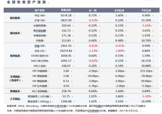 隨著市場(chǎng)消化朝鮮半島的緊張局勢(shì)、哈維和伊爾瑪颶風(fēng)對(duì)美國(guó)經(jīng)濟(jì)潛在影響,本周全球股市普遍下跌。美股方面,受大型科技股下跌拖累,標(biāo)普500指數(shù)周跌0.61%,道指周跌0.86%,納指周跌1.17%;歐洲股市方面,受歐元持續(xù)升值影響,三大股指多數(shù)下跌,英國(guó)富時(shí)100指數(shù)周跌0.82%,法國(guó)CAC40指數(shù)周跌0.19%,德國(guó)DAX指數(shù)周漲1.33%;亞洲股市方面,因市場(chǎng)擔(dān)心朝鮮可能在上周六朝鮮建國(guó)紀(jì)念日再度發(fā)射導(dǎo)彈,多數(shù)市場(chǎng)下跌,日經(jīng)225指數(shù)周跌2.12%,韓國(guó)綜合指數(shù)周跌0.59%,香港恒生指數(shù)結(jié)束三周連漲,周跌1.02%。展望未來,預(yù)期地緣政治風(fēng)險(xiǎn)對(duì)股市的影響將逐漸減弱,市場(chǎng)將回歸關(guān)注于企業(yè)業(yè)績(jī)表現(xiàn)。在全球經(jīng)濟(jì)同步穩(wěn)健復(fù)蘇的環(huán)境下,我們將持續(xù)關(guān)注權(quán)益類資產(chǎn)投資機(jī)會(huì)。