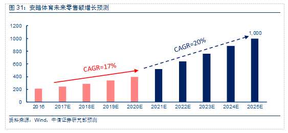 中信證券研究部紡織服裝組預(yù)計(jì)安踏體育2017~2020年整體銷售額復(fù)合增速15-20%,其中安踏品牌銷售額復(fù)合增速達(dá)雙位數(shù)、FILA銷售額復(fù)合增長有望超30%、DESCENTE銷售額達(dá)到25億、2020年電商占總銷售額比例望達(dá)20%;到2025年有望實(shí)現(xiàn)千億銷售額。