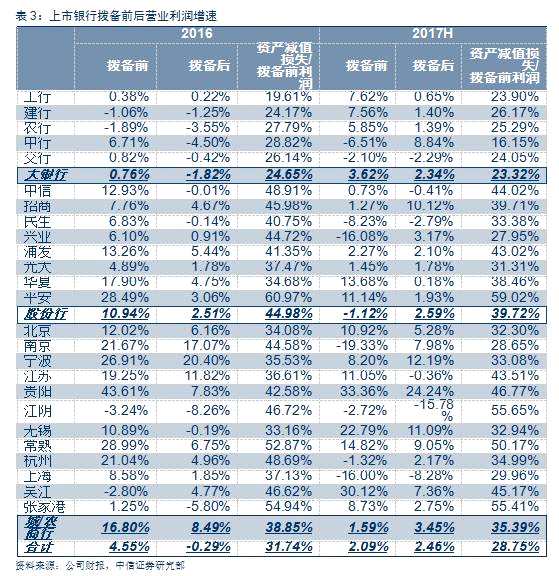 撥備反哺利潤主要體現(xiàn)在股份行和城商行:(1)大銀行保持撥備計(jì)提,2017H1的“資產(chǎn)減值損失/撥備前利潤”與2016年基本持平略有下降(五大行中僅中行下降較多),主要源于大銀行撥備覆蓋率本身較低、需要補(bǔ)充撥備;(2)股份行和城商行的“資產(chǎn)減值損失/撥備前利潤”分別為39.72%和35.39%,均較2016年有明顯下降,撥備后的營業(yè)利潤增速也較撥備前有顯著提升,其中招商、民生、興業(yè)、南京撥備反哺利潤的策略尤其積極,不過也有部分銀行仍在增加撥備計(jì)提,如華夏、平安、江蘇、貴陽、江陰、無錫、吳江等。