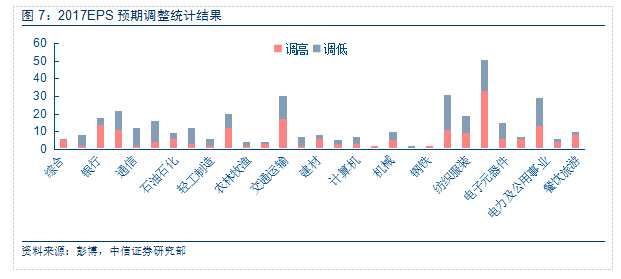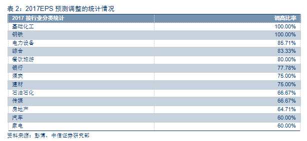我們對(duì)比3月前與當(dāng)前對(duì)行業(yè)2017EPS的彭博預(yù)測(cè),發(fā)現(xiàn)投資者對(duì)市場(chǎng)轉(zhuǎn)向樂觀,高達(dá)52%的公司2017年EPS預(yù)期被上調(diào)。