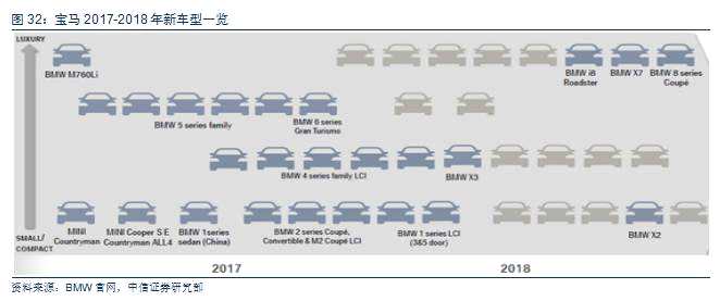 為什么選寶馬經(jīng)銷商?寶馬開啟強(qiáng)勢(shì)車型周期。BBA三強(qiáng)占據(jù)中國豪車市場(chǎng)的75%的市場(chǎng)份額,市場(chǎng)份額格局穩(wěn)定,但盈利能力受7年車型大換代周期影響明顯。寶馬已于2017年開啟全新車型周期,將推出包括新5系在內(nèi)的14款車型寶馬第六代7系(G11)于2015年10月正式上市,第七代5系(G30)也于2017年2月量產(chǎn),其中國產(chǎn)華晨寶馬5系已于6月23日正式開始銷售。預(yù)計(jì)此次寶馬全新車型周期的開啟將帶來持續(xù)兩年的產(chǎn)品密集投放:包括全新5系、X3、1系三廂版、X1插電混動(dòng)版等6款國產(chǎn)新車,以及M760Li、寶馬X7、寶馬8系Coupe和新一代MINI Countryman等8款進(jìn)口車型。其中,寶馬X3在國產(chǎn)后有望大幅降低售價(jià),提高銷售終端的競(jìng)爭(zhēng)力。此外,寶馬另兩大主力車型3系大改款和X1中期改款將有望于2019年上半年開始量產(chǎn)。