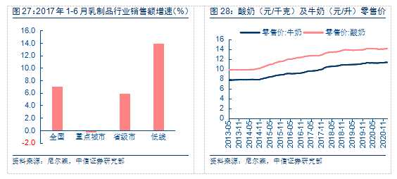 根據(jù)草根調(diào)研,H1伊利基礎(chǔ)白奶及優(yōu)酸乳等低線產(chǎn)品均恢復(fù)10%以上增長,佐證該猜想。2017年1-7月,全國乳制品銷售額增長率為6.8%,整體復(fù)蘇明顯,其中縣級(jí)乳制品銷售額增長率為13.6%,遠(yuǎn)高于重點(diǎn)城市0.02%、省級(jí)市5.5%、地級(jí)市6.6%。