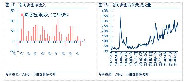 今年南下資金以保險(xiǎn)資金等配置型需求為主,機(jī)構(gòu)首先配置的對(duì)象為大權(quán)重股票,以避免跑輸指數(shù)過多,其次在相對(duì)中型和小型的股票中尋找alpha。隨著南下資金的認(rèn)知加深,我們看到南下資金在一部分行業(yè)和公司中已經(jīng)是占比很高,足以影響這些行業(yè)以及公司的股價(jià)表現(xiàn)了(例如,港股通南下資金持有市值占汽車行業(yè)自由流通自由市值超過12%,持有材料板塊占比也超過8%)。