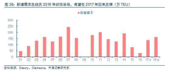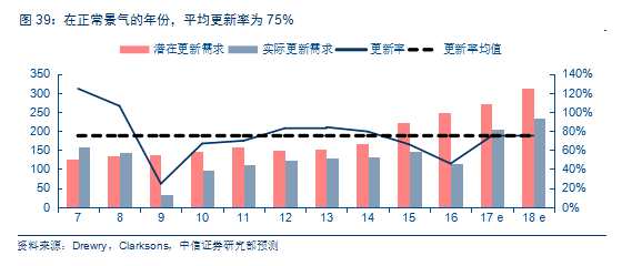 根據(jù)中信證券研究部機(jī)械組預(yù)計(jì),如果集裝箱保有量增速與全球集運(yùn)需求增速一致,新增需求將達(dá)到每年約130萬箱。更新率更關(guān)鍵,正常情況下,集裝箱的更新周期為12年。平均來看,更新率(實(shí)際更新需求/潛在更新需求)為75%。我們以過去11-13年前的銷量平均值作為潛在更新需求,按照75%的更新率計(jì)算,2017年和2018年的實(shí)際更新需求有望達(dá)到200萬和230萬TEU。