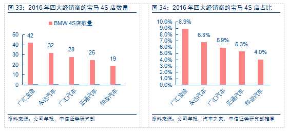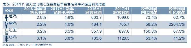 寶馬核心經(jīng)銷商上半年受惠于“678”政策,銷售毛利率提升明顯,下半年將繼續(xù)受益于新5系從“折價(jià)”銷售轉(zhuǎn)為“加價(jià)銷售”的過程,銷售毛利率有望繼續(xù)提高。此外,四大核心經(jīng)銷商市場(chǎng)占有率超過31%,在各自銷售主力區(qū)域內(nèi)保持較高的集中度,競(jìng)爭(zhēng)業(yè)態(tài)較為健康。