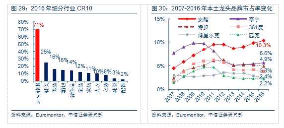 其二,運(yùn)動(dòng)鞋服。在歷經(jīng)粗放擴(kuò)張、慘痛調(diào)整、復(fù)蘇增長之后,步入穩(wěn)健高景氣階段。根據(jù)Euromonitor數(shù)據(jù),行業(yè)未來5年CAGR為7.6%,遠(yuǎn)高于其他服飾細(xì)分行業(yè)。同時(shí),我國運(yùn)動(dòng)鞋服行業(yè)已基本完成洗牌、格局較穩(wěn),2016年CR10達(dá)71%,因此投資龍頭是享受行業(yè)增長紅利的首選。