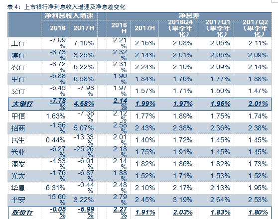 息差方面,逐步企穩(wěn),其中大行率先走上回升通道、中小行則開始觸底改善。由于銀行未披露單季息差,因此我們利用期初期末平均余額法來分析單季息差的改變:總體25家上市銀行二季度單季凈息差1.93%,環(huán)比一季度上升2BP。分銀行看:(1)大銀行二季度息差已環(huán)比上升至2.01%(一季度1.96%),其中除交行外均有不同幅度的上升;(2)股份行和城商行二季度凈息差則繼續(xù)下降,不過降幅已有明顯收窄(股份行平均環(huán)比降3BP至1.80%,城商行降11BP至1.64%),而20家股份行和城商行中也有銀行開始環(huán)比上升。