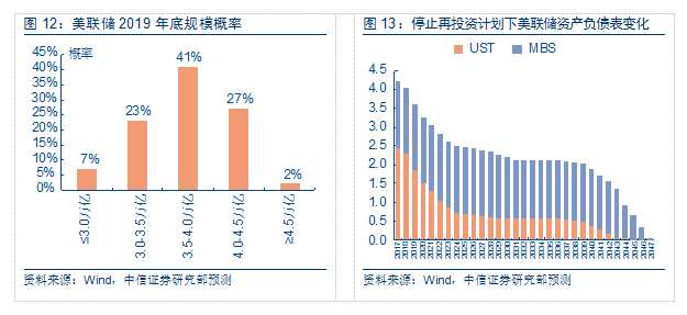 2017年下半年加息的概率在降低,海外資金最大的風(fēng)險(xiǎn)可能是縮減資產(chǎn)負(fù)債表。中信證券研究部宏觀團(tuán)隊(duì)對(duì)美聯(lián)儲(chǔ)縮表方式的基準(zhǔn)判斷是:美聯(lián)儲(chǔ)將可能按照“被動(dòng)式、循序漸進(jìn)、可預(yù)測(cè)”的原則進(jìn)行縮表,考慮到貨幣需求的增長、貨幣市場(chǎng)更高的準(zhǔn)備金要求、銀行流動(dòng)性的變動(dòng),美聯(lián)儲(chǔ)資產(chǎn)負(fù)債表規(guī)模最終可能由當(dāng)前的4.5萬億縮減至2.5萬億至3.4萬億美元間。