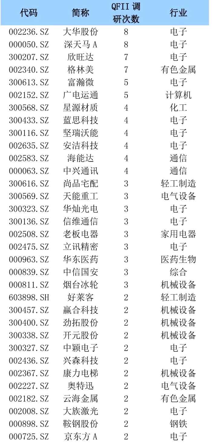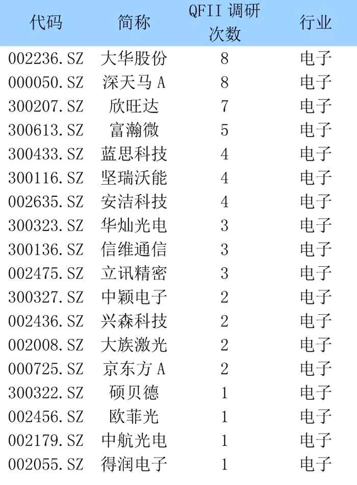 9月接受QFII調(diào)研的電子行業(yè)個股