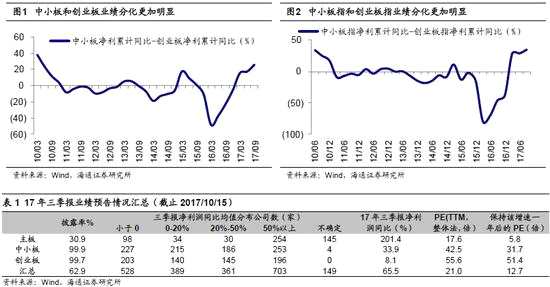 中小板、創(chuàng)業(yè)板前三季度凈利累計(jì)同比為33.9%、8.1%,業(yè)績分化趨勢更加明顯。每個(gè)公司三季報(bào)預(yù)告的凈利潤是一個(gè)區(qū)間,我們?nèi)∑渖舷孪薜乃阈g(shù)平均值近似代替為三季報(bào)的凈利潤值,由此進(jìn)行后續(xù)的所有分析。以披露三季報(bào)預(yù)告的公司為樣本,中小板、創(chuàng)業(yè)板前三季度凈利潤累計(jì)同比分別為33.9%、8.1%,而中報(bào)為23.1%、5.7%,中小板指、創(chuàng)業(yè)板指前三季度凈利同比分別為26.3%、-8.5%,而中報(bào)為13.6%、-15.2%。其中,創(chuàng)業(yè)板剔除溫氏股份(300498)和東方財(cái)富(300059) (下稱溫氏和東財(cái))前三季度累計(jì)凈利同比為22.6%,而中報(bào)為23.0%。綜合來看,主板披露率較低,數(shù)據(jù)可比性較弱,中小板保持高增長,創(chuàng)業(yè)板增速較低。預(yù)告顯示,中小創(chuàng)業(yè)績分化趨勢更加明顯,中小板-創(chuàng)業(yè)板凈利累計(jì)同比從16Q1的-48.0個(gè)百分點(diǎn)回升至17Q3的25.8個(gè)百分點(diǎn),中小板指-創(chuàng)業(yè)板指凈利累計(jì)同比從-69.5個(gè)百分點(diǎn)回升至34.7個(gè)百分點(diǎn)。