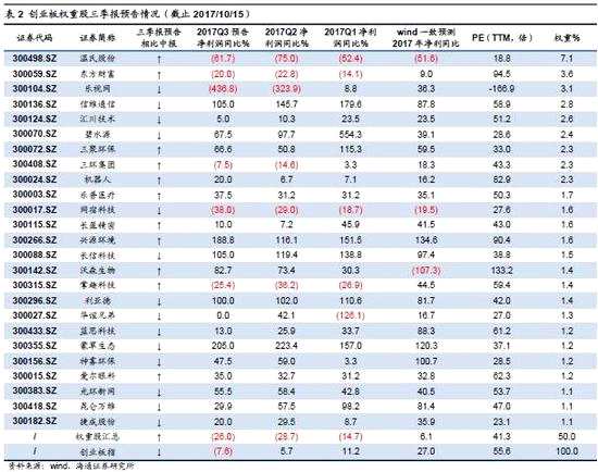 創(chuàng)業(yè)板三季度單季度凈利同比為22.1%,剔除溫氏和東財(cái)后為28.7%。根據(jù)三季報(bào)業(yè)績預(yù)告,創(chuàng)業(yè)板全體和創(chuàng)業(yè)板指數(shù)(100家)三季度單季度凈利同比分別22.1%、-2.2%,二季度分別為1.9%、-21.7%,而剔除溫氏和東財(cái)后為28.7%、11.2%,二季度分別為20.4%、8.5%。估值上,當(dāng)前創(chuàng)業(yè)板、創(chuàng)業(yè)板剔除溫氏和東財(cái)后PE(TTM,整體法,下同)為56、58倍,創(chuàng)業(yè)板指、創(chuàng)業(yè)板指剔除溫氏和東財(cái)后PE為倍44、47倍??傮w上,創(chuàng)業(yè)板整體和指數(shù)業(yè)績增速有所改善,結(jié)構(gòu)上權(quán)重股業(yè)績較差,三季報(bào)預(yù)告顯示創(chuàng)業(yè)板權(quán)重股(權(quán)重最大的前50%只)凈利累計(jì)同比為-26.0%,而創(chuàng)業(yè)板指整體為-7.6%,權(quán)重股業(yè)績下滑拖累創(chuàng)業(yè)板凈利增速處于低位。