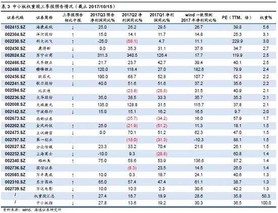 中小板三季度單季度凈利同比為42.3%,較二季度略有提高。根據(jù)三季報(bào)業(yè)績預(yù)告,中小板全體和中小板指數(shù)(100家)(均不含券商,中小板券商暫并無財(cái)報(bào)數(shù)字預(yù)告)三季度單季度凈利同比分別為42.3%、29.9%,比二季度的20.7%、9.3%略提高。估值上,當(dāng)前中小板PE為42倍,中小板指為37倍。大體上,中小板整體和指數(shù)業(yè)績保持高增長,權(quán)重股成為穩(wěn)定業(yè)績的主心骨,三季報(bào)預(yù)告顯示中小板權(quán)重股17年前三季度凈利累計(jì)同比為27.4%,而中小板指為27.8%,中小板權(quán)重股表現(xiàn)優(yōu)異,帶動中小板業(yè)績整體保持高位。