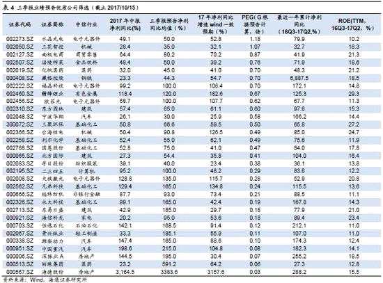 部分公司業(yè)績靚麗。自16年以來A股進(jìn)入震蕩市,市場開始重視業(yè)績,投資者更加關(guān)注估值和盈利的匹配度。我們綜合考慮公司業(yè)績的增長性和估值的合理性,并排除了基期因素與業(yè)績突變的影響,我們對已經(jīng)披露三季報(bào)預(yù)告的公司進(jìn)行了篩選。具體篩選指標(biāo)包括:1、17年三季報(bào)預(yù)告凈利同比增速較中報(bào)改善,中報(bào)和三季報(bào)預(yù)告凈利潤同比增速大于20%,wind一致預(yù)期17年凈利潤同比大于20%;2、最近一年累計(jì)凈利同比(16Q3-17Q2)超25%,ROE(TTM,16Q3-17Q2)超10%,確保盈利穩(wěn)定性。3、當(dāng)前PE(TTM)小于35倍,PEG小于1.3倍。