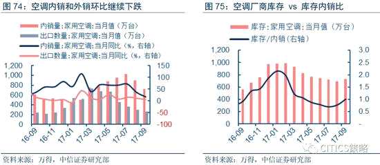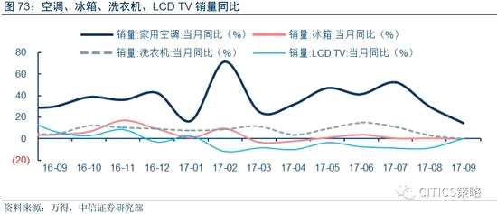 ?家電:需求方面,9月空調總銷量同比上升14.5%,內銷量環(huán)比下跌幅度增加,環(huán)比下跌19.9%,而出口量環(huán)比繼續(xù)下跌,景氣度向下。9月洗衣機銷量同比繼續(xù)上升,冰箱銷量同比增速緩慢上升,LCD TV銷量繼續(xù)同比上升。供給方面,9月空調產量同比增速下滑,洗衣機產量同比繼續(xù)增長,8月冰箱產量同比增長,空調、冰箱庫存內銷比同比上升,洗衣機庫存內銷比同比下降。