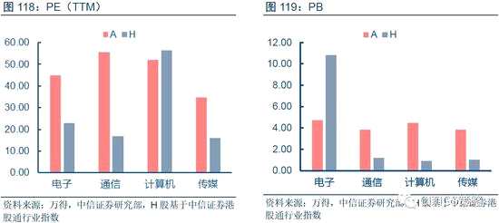 除計算機行業(yè),A股TMT各行業(yè)PE高于H股,除電子行業(yè)外,A股TMT各行業(yè)PB皆遠超H股。以10月24日股價計算,TMT行業(yè)中A股電子、通信和傳媒行業(yè)PE(TTM)分別44.92、55.53、34.59,遠高于H股的22.83、16.71、15.91,A股計算機行業(yè)PE(TTM)為51.99,低于H股的56.35。H股電子行業(yè)PB為10.82遠高于A股的4.72,A股通信、計算機和傳媒行業(yè)PB為3.83、4.47和3.83,遠高于H股的1.20、0.90和1.01。