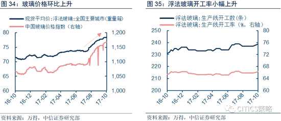 玻璃價格環(huán)比上升,浮法玻璃開工率小幅上升。截至10月23日,中國玻璃價格指數1166.39,環(huán)比上漲1.3%(上期值3.2%),全國主要城市浮法玻璃現貨平均價格78.36元/重量箱,環(huán)比小幅上漲1.3%(上期值3.0%),浮法玻璃生產線開工數239條,環(huán)比上升0.8%,浮法玻璃開工率66.39%,環(huán)比上升0.56個百分點,同比上升0.01個百分點。9月全國平板玻璃產量為6324.00萬重量箱,環(huán)比下降3.1%,同比上漲0.4%。去產能政策繼續(xù)顯現作用,供給穩(wěn)中有降,玻璃走勢良好,預計玻璃價格未來依然會小幅上升。