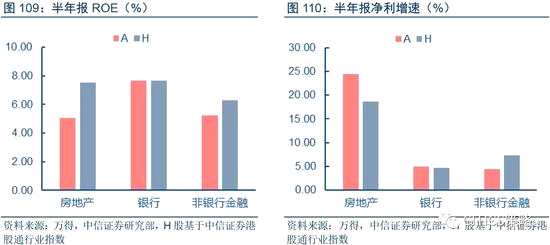 ROE方面,A股銀行板塊和H股持平,非銀金融和房地產A股低于H股。根據半年報財務數據,A股的銀行ROE達7.68%,基本和H股的7.65%相同,A股房地產和非銀金融的ROE為5.06%、5.25%,低于H股的7.51%、6.31%。半年報凈利增速方面,A股銀行、非銀金融和房地產凈利增速相對H股情況各有不同,A股房地產凈利潤增速高于H股,銀行則持平,非銀金融凈利潤增速A股要低于H股。