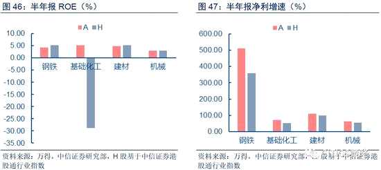 除化工行業(yè)外,A股與H股半年報ROE較接近,略低于H股。A股凈利潤增速高于H股,鋼鐵行業(yè)A股凈利潤增速遠高于H股?;诎肽陥筘攧諗祿?,A股鋼鐵、建材和機械行業(yè)ROE分別為4.22%、4.78%、2.99%,略低于H股的5.24%、5.31%、3.04%,基礎化工行業(yè)ROE為5.18%,遠遠高于H股ROE的-28.89%。半年報凈利增速方面,A股基礎化工、建材、機械行業(yè)分別達到70.80%、110.43%、64.26%,高于H股的52.72%、100.12%、53.56%。鋼鐵行業(yè)中,A股凈利潤增速511.33%,遠高于H股的360.50%。