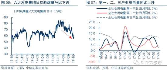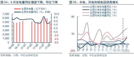 ?電力:供給方面,9月發(fā)電量同比增速下降,環(huán)比下降,其中火電、水電、核電和風電發(fā)電量同比均增長,火電增速大幅下滑。9月全國發(fā)電量為5220億千瓦時,同比增長6.2%。10月發(fā)電集團日均耗煤量同比上漲。需求方面,9月全社會用電量同比增速7.1%,第一產業(yè)、第二產業(yè)和第三產業(yè)用電量同比均不同程度增長。