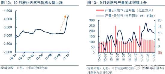 10月液化天然氣價格大幅上漲,9月天然氣產量環(huán)比下降6.7%。截至10月23日,液化天然氣市場價為4116.7元/噸,環(huán)比大幅上升31.60%,同比大增47.50%。9月天然氣產量為112億立方米,環(huán)比下降6.70%,同比上升10.30%。