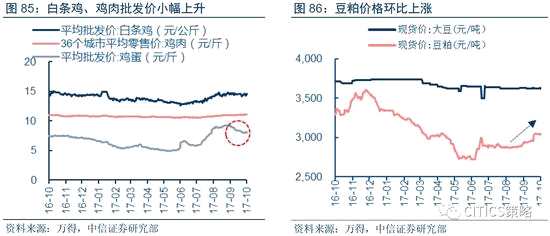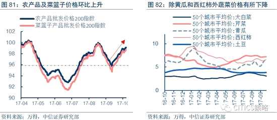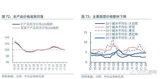 農產品價格總體有小幅上升,蔬菜走勢好轉;豬肉相關價格繼續(xù)下跌,但成本價格下降,供給減少,預計豬肉價格會有上升空間;雞肉相關由于雞苗價格下跌,仍有上升可能性。預計農產品總體仍是穩(wěn)中有升,上升動力在豬肉、豆粕和蔬菜中。