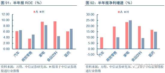 A股除了家電和食品飲料,其他三個行業(yè)半年報ROE均低于H股,A股家電半年報凈利潤增長率低于H股,其余都顯著高于H股增長率?;诎肽陥筘攧諗祿?,A股家電和食品飲料ROE高于H股,汽車、商貿、醫(yī)藥行業(yè)則是H股ROE更高。半年報凈利增速方面,家電行業(yè)A股低于H股,其他行業(yè)則是A股凈利增速更高。