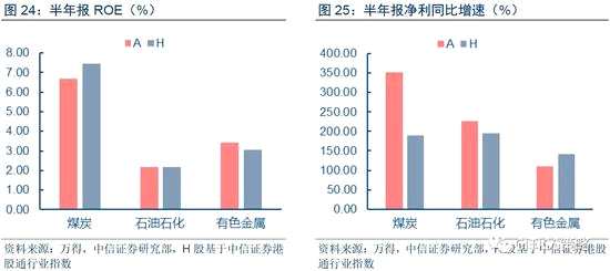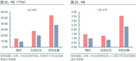 A股煤炭、油氣和有色金屬行業(yè)的估值顯著高于H股,根據10月23日數據,A股這三個行業(yè)的PE分別為14.68、27.70、54.58,高于H股的9.40、20.25、38.08。PB方面,A股估值普遍高于H股,A股煤炭、油氣和有色金屬行業(yè)的PB值分別為1.46、1.30、3.57,高于H股的1.00、0.85、2.35。