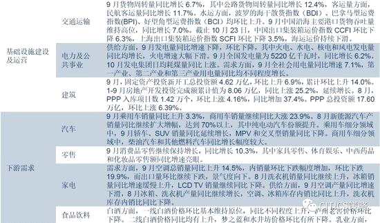 ???基礎設施建設與運營:10月中國出口運價指數下降,9月貨物周轉量同比增長6.7%,其中公路貨物周轉量同比增長12.4%,客運量方面,民航客運量同比增長11.7%。10月發(fā)電量同比增速下降,環(huán)比下降,9月全社會用電量同比增速為7.1%。9月,固定資產投資新開工總投資額4.62萬億,環(huán)比上升6.9%,1-9月房地產開發(fā)投資完成額同比上漲25.2%。