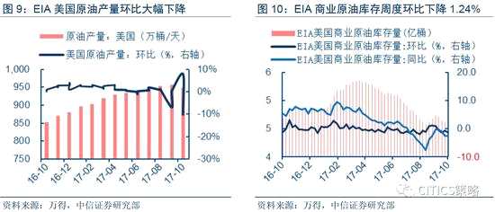 9月OPEC原油產量環(huán)比小幅回升,同比繼續(xù)下降。9月OPEC原油產量為3274.8萬桶/日,較8月上升0.3%。截至10月23日,EIA數據顯示,美國原油產量為840.6萬桶/日,環(huán)比下降10.13%,同比下降0.69%。庫存方面,截至10月23日,EIA美國商業(yè)原油庫存量為4.56億桶,環(huán)比下降1.24%,同比下降2.61%。9月受利比亞最大油田開工影響,OPEC原油產量小幅上升,但是OPEC官方公布9月召開的聯(lián)合部長級監(jiān)督會議的結果,減產執(zhí)行率達到120%,并且OPEC預計未來全球對石油需求繼續(xù)上升,可以穩(wěn)步降低庫存。另一方面,美國由于氣候原因產量大幅減少。預計未來OPEC產量會繼續(xù)保持小幅下降的趨勢,維持減產計劃,而由于冬季供暖需求,美國原油產量接下來預計會有回升。