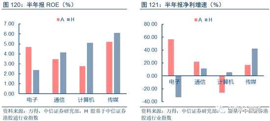 A股通信、計算機、傳媒行業(yè)半年報ROE低于H股,A股電子和通信凈利潤增速高于H股,計算機和傳媒A股凈利潤增速低于H股?;诎肽陥筘攧諗祿?,H股通信、計算機和傳媒ROE顯著高于A股,分別達到4.16%、5.11%、6.10%,而A股僅為3.49%、2.76%、5.21%。半年報凈利增速方面,H股計算機和傳媒行業(yè)增長率,達到5.53%、42.25%,高于A股的-26.18%、16.80%,A股電子和通信的凈利增速達到56.84%、21.71%高于H股的-33.32%和11.58%。