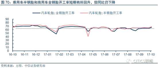 具有領先指標意義的乘用車半鋼胎和商用車全鋼胎開工率短期有所回升,但同比仍下降。截止至10月23日,半鋼胎開工率65.83%,環(huán)比上升0.22個百分點,同比下降6.20個百分點,全鋼胎開工率64.10%,環(huán)比上升1.63%,同比下降4.86%。