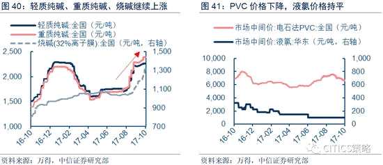 無機化工方面,輕質重質純堿、燒堿價格繼續(xù)上漲,液氯價格持平,PVC環(huán)比下跌8.9%。截至10月23日,純堿產業(yè)鏈中輕質純堿、重質純堿繼續(xù)上漲,分別環(huán)比上漲2.6%、4.7%,但是增速大幅下滑。氯堿產業(yè)鏈中燒堿環(huán)比上漲16.0%,液氯價格持平,電石法PVC價格環(huán)比下跌8.9%。受下游產品影響,純堿價格上升幅度大幅減少,而下游PVC價格繼續(xù)下跌,預計11月純堿價格難以繼續(xù)上升。