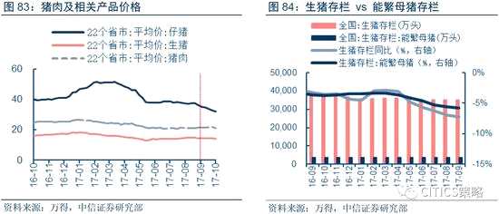 豬肉價、生豬和仔豬價格下跌,存欄量繼續(xù)小幅下降。截至10月23日,全國22個城市仔豬平均價31.96元/公斤,環(huán)比下跌8.9%,生豬平均價格14.18元/公斤,環(huán)比下降2.4%,豬肉平均價格21.01元/公斤,環(huán)比下降2.5%。9月生豬存欄數為3.50億頭,較上月下降0.2%,能繁殖母豬存欄數為3497萬頭,環(huán)比下降0.7%。