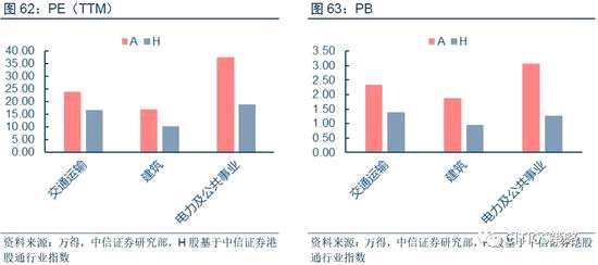 A股交通運輸、建筑和電力及公共事業(yè)行業(yè)的估值水平均高于H股。以10月24日股價計算,交通運輸、建筑和電力及公共事業(yè)行業(yè)PE(TTM)分別為23.92、17.05、37.66。均高于H股的16.83、10.45、18.89。A股交通運輸、建筑和電力及公共事業(yè)行業(yè)PB為2.34、1.88、3.08,均高于H股的1.40、0.96、1.26。