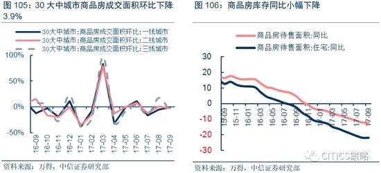 30大中城市商品房成交面積來看,9月共成交1399.61萬平方米,環(huán)比下降3.90%,一、二、三線城市成交面積分別為223.58、776.75、399.28萬平方米,環(huán)比增速分別為-0.53%、-2.61%、-8.0%。9月商品房銷售面積同比首次下降,銷售端回落加強,成交面積環(huán)比同比均下降,同比大幅下降。另一方面,房地產庫存自年初以來穩(wěn)步下降,9月新開工面積增加,在政策不變的情況下,預計未來房地產銷售仍會低迷,價格仍是同比增幅下降。