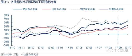 各類鋼材毛利情況均不同程度改善,其中冷軋板毛利環(huán)比大幅上升52.1%。截至10月23日,熱軋板、冷軋板、螺紋鋼、中厚板噸毛利分別為947.00元/噸、596.00元/噸、848.00元/噸和650.00元/噸,毛利分別環(huán)比增長26.8%、52.1%、11.0%、30.1%,毛利率分別為34.8%、17.4%、33.4%、22.7%。