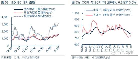 ?交通運輸:9月貨物周轉量同比增長6.7%,其中公路貨物周轉量同比增長12.4%,客運量方面,民航客運量同比增長11.7%。水運方面,波羅的海干散貨指數(BDI)、巴拿馬型運費指數(BPI)、好望角型運費指數(BCI)均環(huán)比上升。9月中國沿海主要港口貨物吞吐量維持高位,同比增長7.0%。截止10月23日,中國出口集裝箱運價指數CCFI環(huán)比下降6.3%,上海出口集裝箱運價指數SCFI環(huán)比下降3.5%,海運運價持續(xù)下滑。