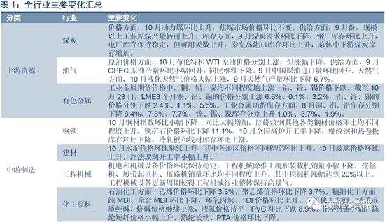 ???上游資源:10月動力煤價格小幅上升,焦煤價格下跌,下游需求略有下降,庫存增加。10月布倫特和WTI原油價格環(huán)比小幅上升,天然氣價格大幅上漲,看好天然氣的持續(xù)高景氣。LME工業(yè)金屬期貨價格,銅、鉛、鎳均不同程度地上漲,鋁、鋅、錫價格下跌,黃金、白銀價格環(huán)比均小幅下降。