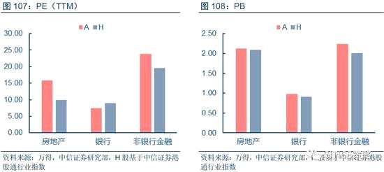 除了銀行,A股大金融板塊估值水平PE(TTM)顯著高于H股,而PB方面A股和H股基本持平。以10月24日股價計算,房地產和非銀金融行業(yè)PE(TTM)分別為15.83、23.84,高于H股的9.95、19.52,A股的銀行PE(TTM)為7.41,低于H股的9.02。PB方面,A股與H股的PB基本一致,A股房地產、銀行、非銀金融的PB分別為2.12、0.98、2.24,H股為2.09、0.91、2.01。