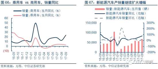 ?汽車:9月乘用車銷量同比上升3.3%,商用車銷量繼續(xù)同比大漲23.9%。8月新能源汽車產銷量同比繼續(xù)擴大增幅,達到70%以上,其中純電動汽車份額提升。乘用車細分領域中,9月轎車、SUV銷量同比延續(xù)增長,MPV和交叉型銷量同比下降。商用車細分領域中,柴油汽車和其他燃料汽車同比增長幅度較大。8月全國經銷商庫存深度環(huán)比大幅下降,7月全國汽車經銷商信心指數回升。截止10月23日,具有領先指標意義的乘用車半鋼胎和商用車全鋼胎開工率短期有所回升,但同比仍下降。
