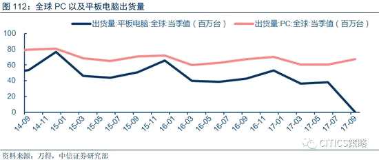 三季度PC及平板出貨量環(huán)比開始有小幅增長,行業(yè)增長有起色。2017年三季度全球PC出貨量6719萬臺,環(huán)比增長11.0%,同比下降0.5%。平板電腦出貨量37.90萬臺,環(huán)比增長4.7%,同比下降2.1%。