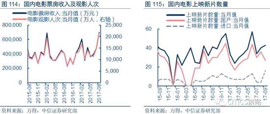 9月電影上映新片數量同比上升4.9%,8月票房同比增長71.9%,觀影人次同比增長69.5%,需求強烈。8月國內電影票房收入69.67億元,同比增長71.9%,觀影人次2.14億人次,同比增加69.5%。9月共上映新片43部,較去年同期上升4.9%,其中國產27部、進口16部,分別環(huán)比下降10.0%、環(huán)比增長45.5%。