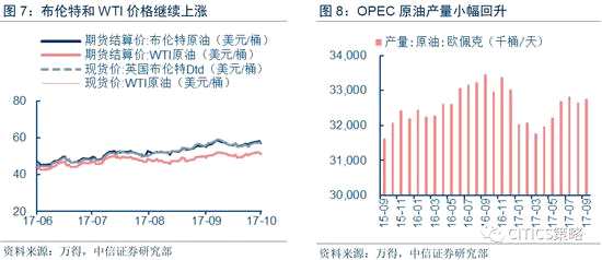 原油價格方面,截至10月23日,布倫特原油現價為57.50美元/桶,環(huán)比上漲0.9%,WTI原油現價為51.29美元/桶,環(huán)比上漲2.8%。截止10月23日,OPEC一攬子原油價格為55.52美元/桶,環(huán)比上漲3.2%,同比上漲13.2%。原油價格繼續(xù)上升,但增速下滑,景氣度有所下降。