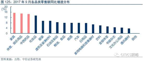 家具零售、體育娛樂、中西藥品和化妝品零售額同比增速亮眼。9月份,家具零售、體育娛樂、中西藥品和化妝品分別增長15.5%、14.9%、14.6%、13.4%。這四種商品零售額從2017年3月以來一直處于10%以上增長,都屬于景氣度高的零售商品,其中家具零售達到增長幅度新高,景氣度好。