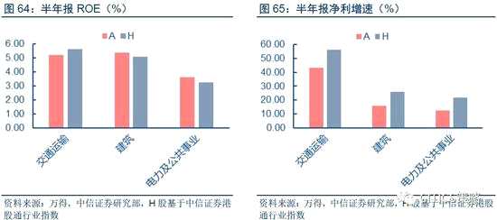 ROE方面,根據半年報財務數據,交通運輸行業(yè)ROE達5.22%,略低于H股的5.63%,而A股建筑行業(yè)和電力與公共事業(yè)的ROE分別為5.37%、3.62%,略高于H股5.10%、3.26%。半年報凈利增速方面,A股交通運輸、建筑和電力及公共事業(yè)行業(yè)凈利潤增速分別為42.99%、15.81%、12.33%,均低于H股的56.24%、26.13%、21.72%。